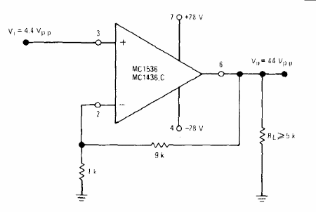 Este amplificador es del Linear Databook de Motorola de 1990. El circuito se puede utilizar con amplificadores operacionales con las mismas características y la fuente de alimentación debe ser simétrica.