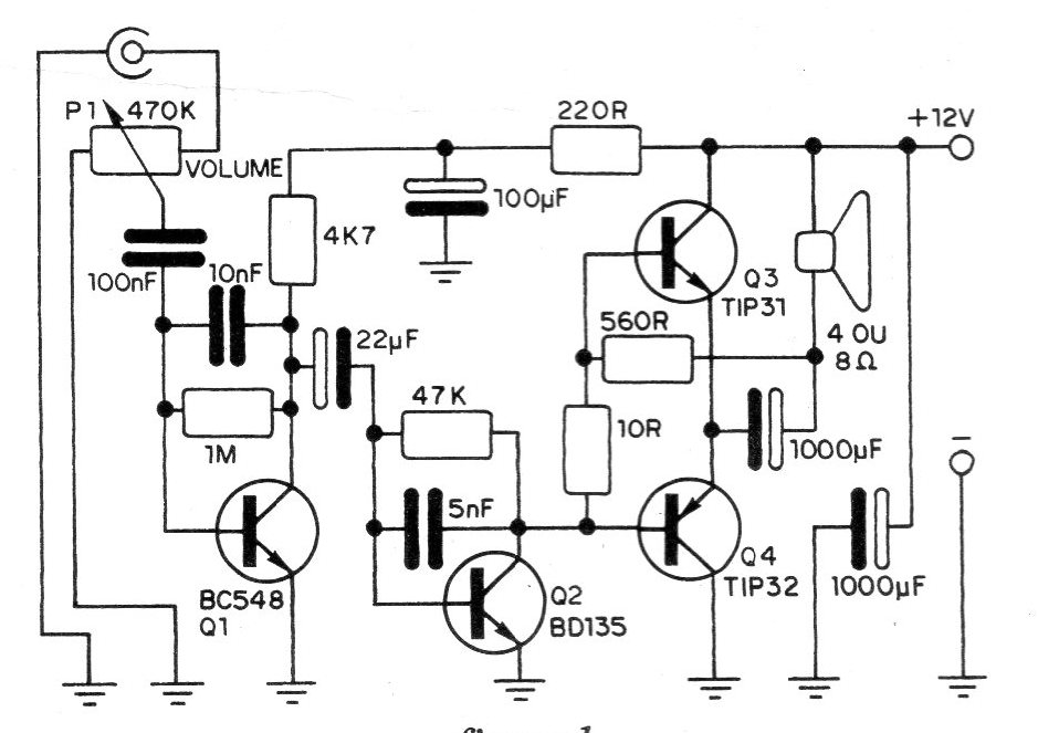 Este amplificador puede funcionar con tensiones entre 12 y 22 V. Esto significa que podemos usarlo en el coche, como amplificador auxiliar o bien en casa, como parte de un sistema económico de alta fidelidad, como reforzador para radios y grabadores portátiles y, hasta incluso en sistemas de aviso y llamada. La potencia, para una alimentación de 12 V, está en torno a 6 W, siendo evidentemente mucho mayor con 22 V de tensión de alimentación. En las condiciones de potencia máxima con tensión de 12 V, la corriente requerida es de aproximadamente 1 A. Esta corriente debe ser observada en el proyecto de una eventual fuente de alimentación para funcionamiento fijo. En la figura tenemos el circuito completo de este amplificador. Como podemos observar por el diagrama, se trata de un amplificador de alta fidelidad con salida en simetría complementaria, usando transistores TIP31 y TIP32, que deben ser montados en buenos disipadores de calor. El altavoz utilizado debe ser de buena calidad, con 4 ó 8 ohms de impedancia. Para menor impedancia tendremos una potencia mayor de salida.