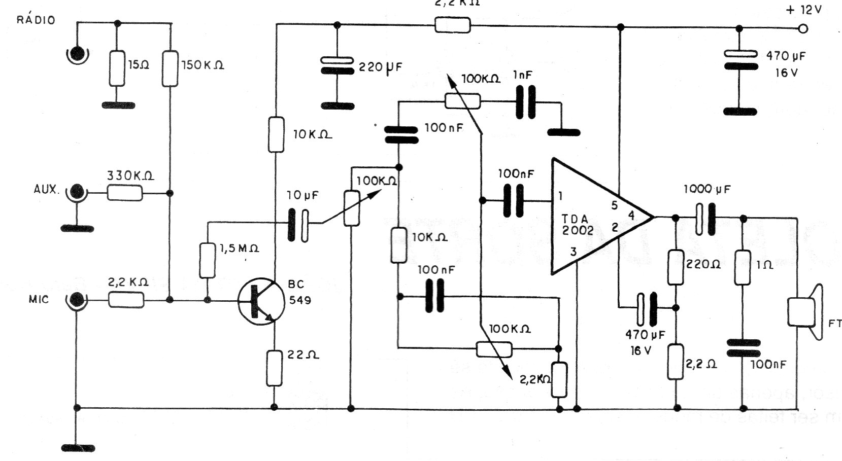 Este excelente amplificador ya ha sido presentado en otras configuraciones en este sitio. Se basa en un circuito integrado TDA2002 y en este caso incluye el control de tonalidad y volume. La alimentación se realiza por 12 V de fuente con al menos 2 A. El circuito tiene tres entradas, según el tipo de señal. El integrado debe estar dotado de un disipador de calor.