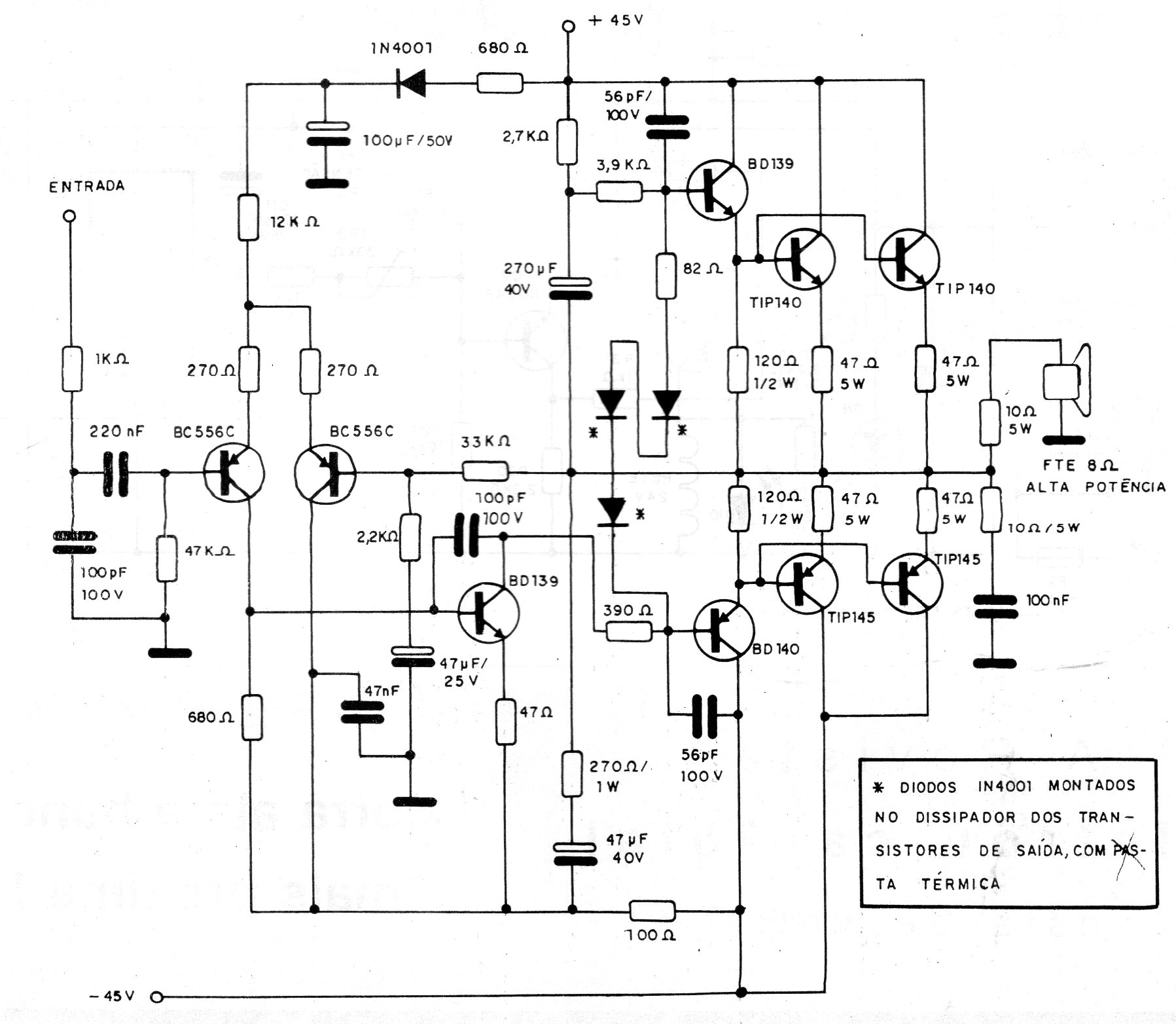 Este amplificador transistorizado de alta potencia fue encontrado en una documentación de 1995. La fuente se da en el CIR2352S. Los transistores deben estar dotados de excelentes disipadores de calor y el diseño de la placa debe prever la circulación de corrientes elevadas con sendas anchas. El circuito es bastante crítico y debe estar protegido con fusibles en la alimentación.