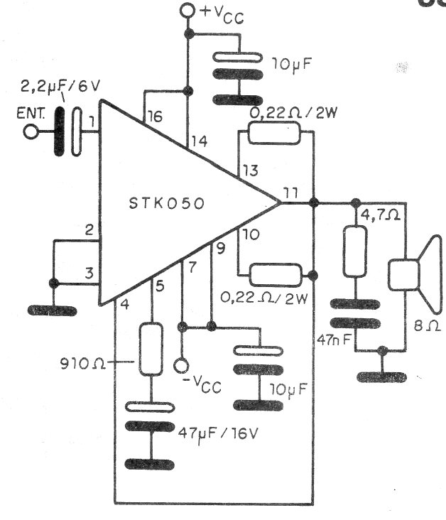 Este circuito de 1992 utiliza un circuito integrado no común actualmente. El circuito integrado de Sanyo debe estar dotado de un buen disipador de calor y la fuente de 35 + 35 V debe suministrar una corriente de al menos 3 A. La resistencia de entrada es de 30 k y la corriente quiescente de 60 mA.