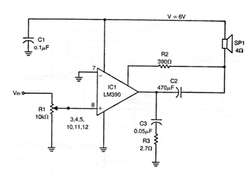 El circuito integrado utilizado en este proyecto ya no es muy común, pero si se encuentra puede resultar en un pequeño amplificador de uso general de excelente calidad. La alimentación es de 6 V y los demás componentes son comunes. Podemos usar el circuito en radios, intercomunicadores, juguetes, etc. El cable de entrada debe ser blindado. Utilice pilas o fuentes de al menos 300 mA para la alimentación.