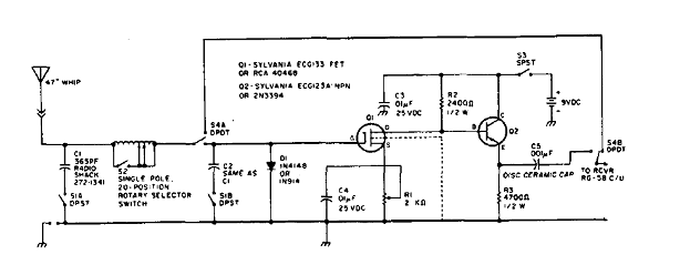 Este circuito amplifica señales de 2 a 30 MHz. El MOSFET puede ser de cualquier tipo para señales y el transistor el BF494 o 2N2222. El circuito es de una documentación de 1977. La bobina consta de 160 espiras de hilo 28 en una forma de ½ pulgada con tomas de 20 en 20 espiras.