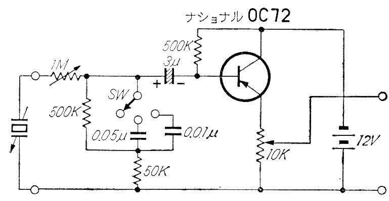 Este preamplificador con un transistor para tocadiscos con cápsulas de cristal fue encontrado en una revista técnica japonesa de los años 60. El transistor es de germanio de la época, pero pueden ser experimentados equivalentes con alteraciones de resistores. El circuito es alimentado por 12 V.