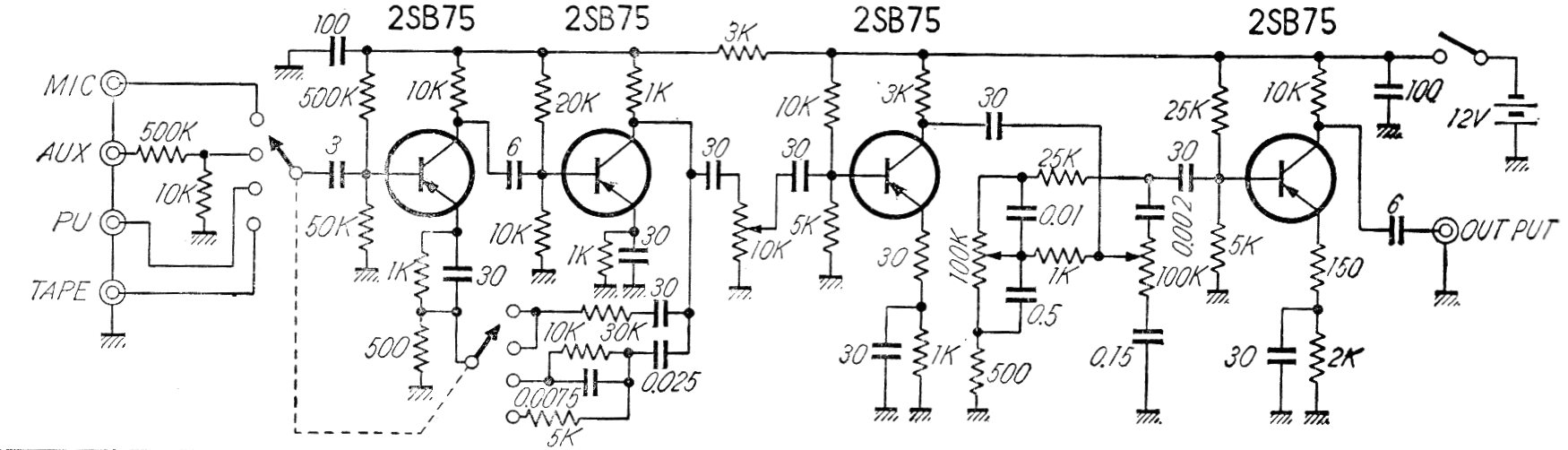 Este pré-amplificador com diversas entradas usando transistores de germânio da época foi encontrado numa documentação japonesa dos anos 60. O circuito tem um controle de graves e agudos Baxandall, ainda novidade na época com excelente desempenho e ganho. A alimentação era feita com tensão de 12 V.