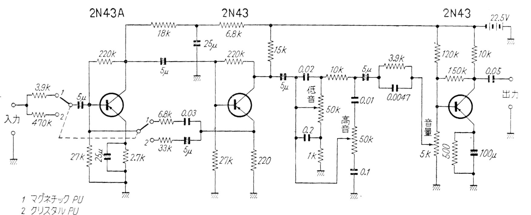 Este circuito es de una antigua documentación japonesa de los años 60. El circuito utiliza transistores de la época y tiene ecualización RIAA con dos impedancias de entrada, según el fonocaptor utilizado. La alimentación se realiza por una batería con una tensión relativamente alta, según las características de los transistores utilizados.