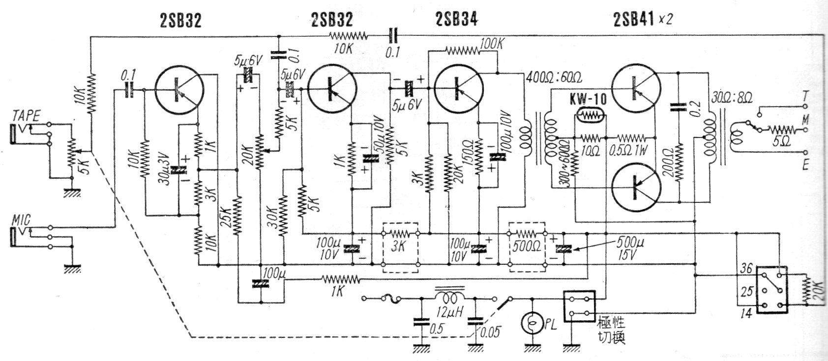 Este amplificador comercial transistorizado de 10 W se vendía en Japón en los años 60. El circuito tenía salida push-pull con transformador y era alimentado por fuente externa de 12 V. Encontramos en él dos entradas, siendo una para toca-cintas y otra para micrófono.