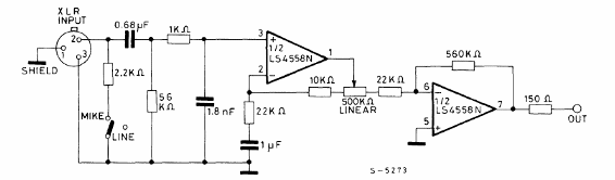 El circuito integrado utilizado en esta aplicación es un doble 741 de la SGS. La alimentación debe ser simétrica y la ganancia se puede ajustar en el modo logarítmico de 0 a 60 dB. Los cables deben ser blindados tanto para la salida como para la entrada.