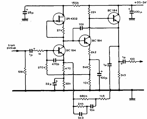 Este circuito se puede utilizar con tocadiscos para la recuperación de medios para CDs y otros. El circuito puede ser elaborado con transistores BC548 y para el FET el BF245, Encontramos esta configuración en una documentación de los años 70. La señal de salida es de pequeña amplitud pudiendo ser aplicada a la entrada de la mayoría de los amplificadores.