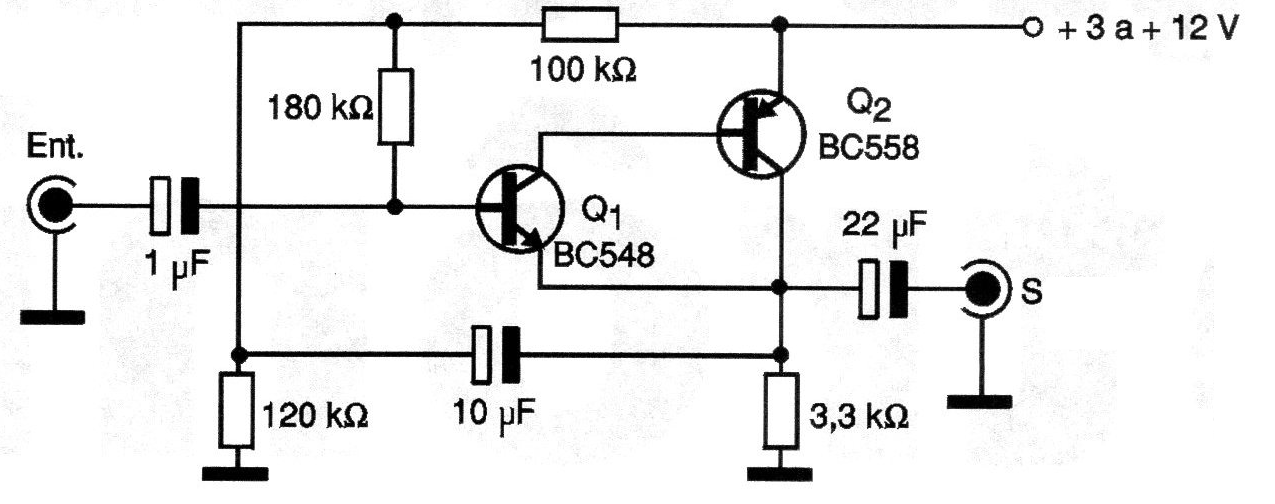 Este circuito presenta una alta impedancia de entrada y utiliza dos transistores bastante comunes en el mercado. Su alimentación puede ser hecha con tensiones de 3 a 12 V lo que lo hace ideal para aplicaciones alimentadas por pilas y baterías.