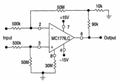 Encontramos este circuito en el Linear Interface ICs de Motorola de 1993. El operacional es poco común en nuestros días, pero la configuración puede ser elaborada con equivalentes.