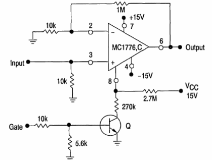 El transistor puede ser cualquiera de uso general, pero el integrado no es común en nuestros días. Pueden ser experimentados equivalentes. El circuito es del Linear Interface IC de Motorola de 1993 y la fuente de alimentación debe ser simétrica.