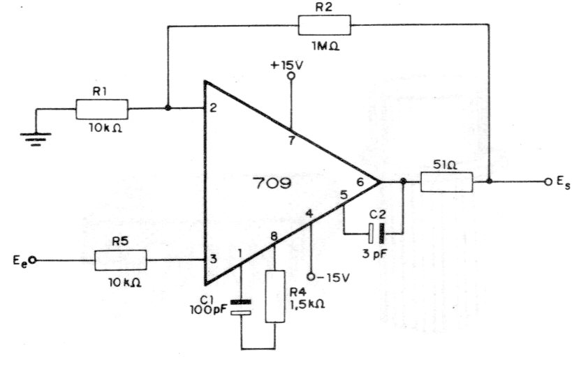 Este circuito de una documentación antigua utiliza un amplificador operacional que ya no se utiliza. La configuración requiere una fuente simétrica, pero se pueden utilizar amplificadores operacionales equivalentes. La ganancia es dada por la relación entre R2 y R1 y se puede cambiar con el cambio de R2;