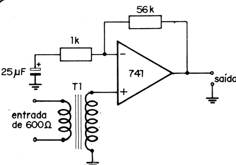 Este circuito utiliza un amplificador operacional 741 que debe ser alimentado por una fuente simétrica de 6 a 12 V. El transformador tiene un primario de 600 ohms y secundario de 50 k. La ganancia es dada por el resistor de realimentación y por el resistor de 1k, pudiendo ser alterado. Otros amplificadores operacionales equivalentes se pueden utilizar.
