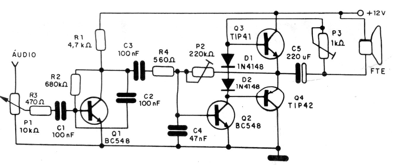 Este circuito proporciona algunos vatios de salida, pudiendo ser usado en el coche como amplificador auxiliar. Los transistores deben montarse en disipadores de calor y el altavoz puede ser de 4 ohms o 8 ohms. El circuito es de una documentación de 1994.