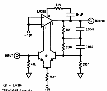 El LM318 no es un componente muy común actualmente. El circuito es sugerido por National Semiconductor en su Linear Applications Handbook de 1994.