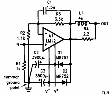 Este amplificador de alta potencia con un solo operacional LM12 (difícil de obtener) es el Linear Applications Handbook de National Semiconductor. El circuito utiliza una fuente simétrica de 40 V.