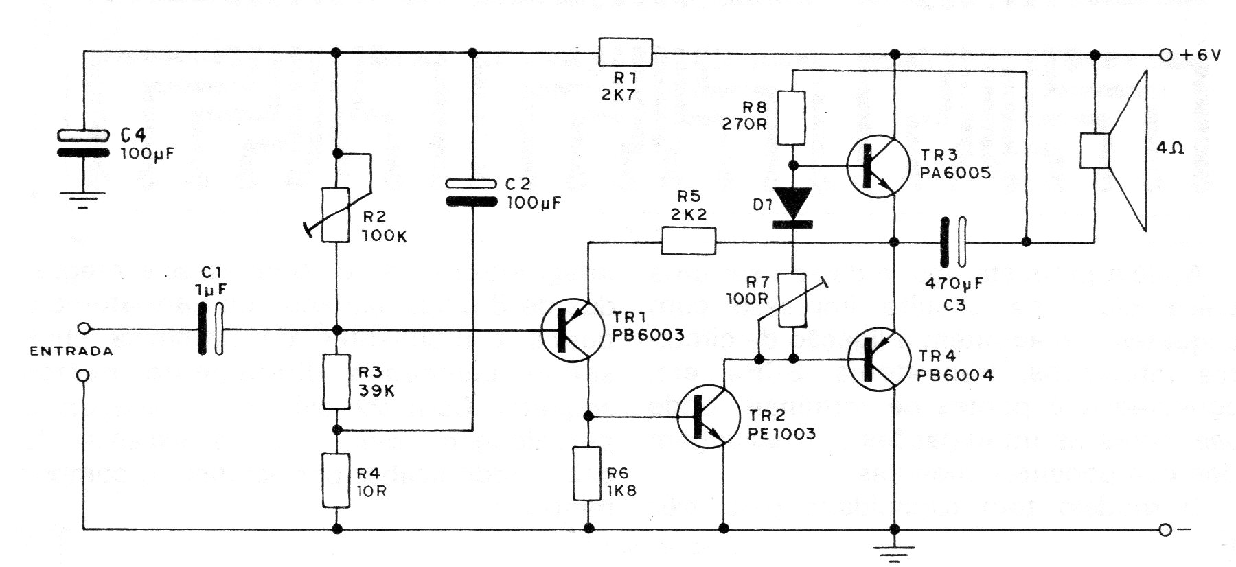 Este amplificador de buena calidad que encontramos en una documentación de 1982 tiene una configuración tradicional en salida complementaria. El circuito es alimentado por una tensión de 6 V que puede venir de pilas o batería. Los transistores originales de Philco de aquella época pueden ser sustituidos por los BD135 y BD136 dotados de pequeños radiadores de calor.