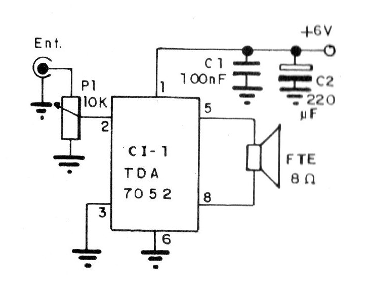 Esta configuración de amplificador es una buena solución actual para quien necesita baja potencia, pocos componentes y baja tensión de alimentación. P1 funciona como control de volumen en este circuito.