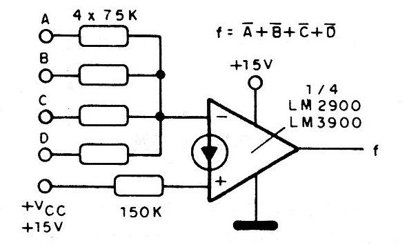 En la figura tenemos la aplicación del amplificador en una puerta NOR, con tensión de referencia igual a la tensión de alimentación. La fuente de alimentación es simple y los resistores de entrada determinan la capacidad de carga (ventilador) del circuito.