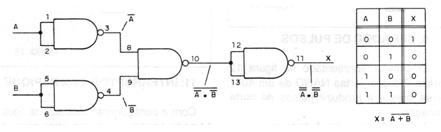 Para la función NOR o no-OU (negativa de la función OU) tomamos la configuración anterior (CIR8762) y añadimos un inversor con otra puerta NAND. Usamos entonces 4 puertas para hacer la configuración completa de la función NOR. En la tabla real vemos que la única condición en que obtenemos el nivel 1 es cuando las dos entradas están en el nivel 0. En las demás condiciones la salida será 0.