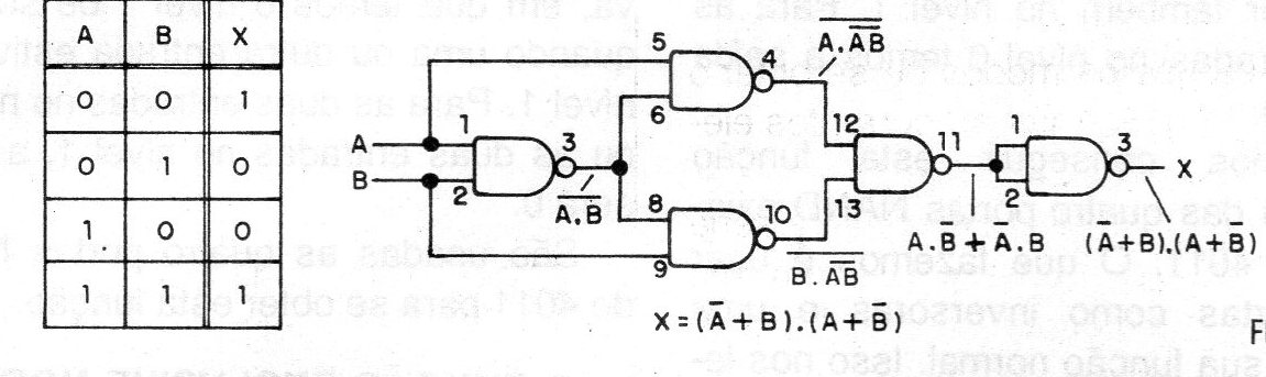 La función no-exclusiva o exclusiva-NOR se puede lograr simplemente añadiendo otro puerto NAND como inversor al circuito anterior (CIR2923S). Sin embargo, quedamos con 5 puertas para el circuito, lo que significa que no podemos utilizar simplemente 1 integrado para esta simulación. La tabla verdad, junto al diagrama, nos muestra que obtenemos 0 en la salida cuando una u otra entrada es 1.