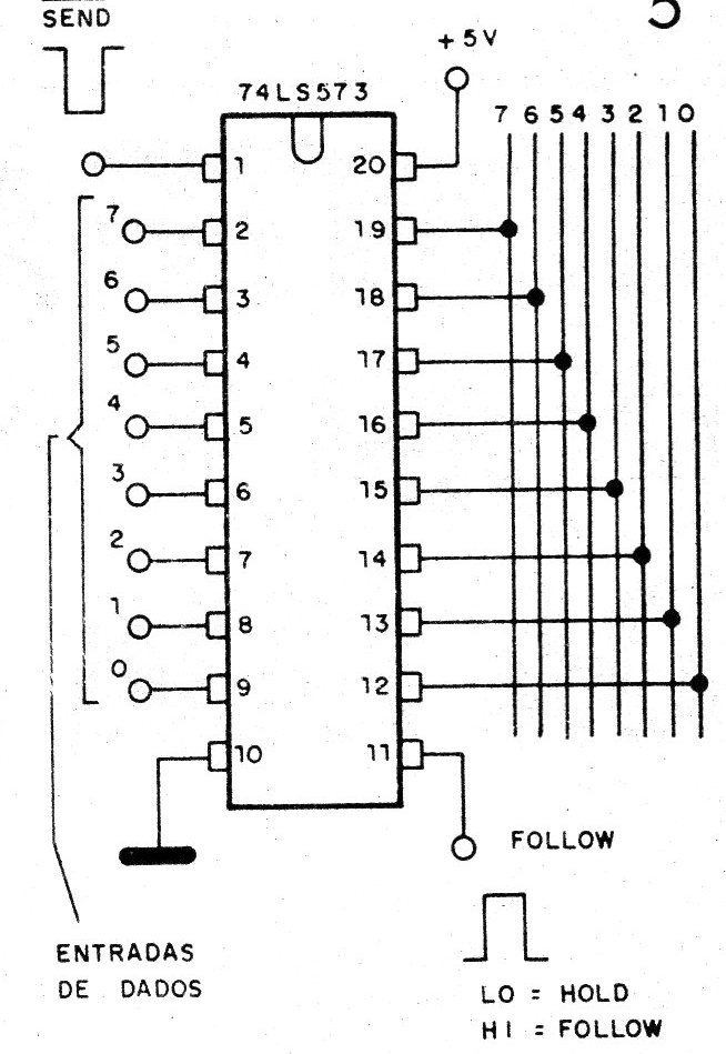 La base de esta aplicación es el integrado 74LSS73. Una palabra de 8 bits puede pasar de una entrada a una salida sin necesidad de almacenamiento. Para grabar una palabra de 8 bits en esta RAM, aplique los datos en la entrada y lleve el pasador Follow momentáneamente al nivel alto. Para retirar la información grabada, lleve la entrada SEND al nivel LO.
