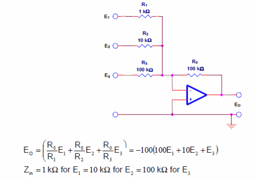 En la figura tenemos un circuito sumador con entradas ponderadas según las resistencias usadas. Las fórmulas que muestran el comportamiento de este circuito están junto al diagrama. El circuito es de una documentación de Texas Instruments de 2016, pudiendo ser implementado prácticamente con cualquier tipo de amplificador operacional.