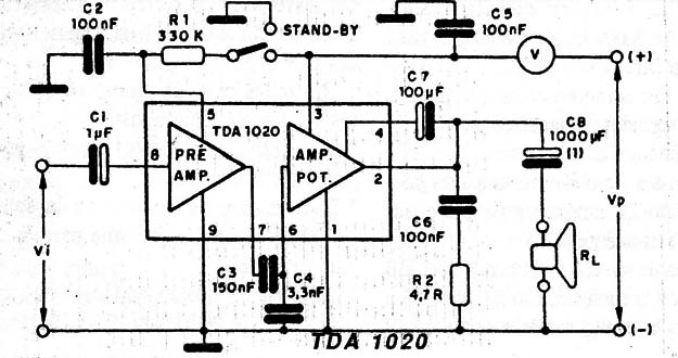 Este circuito entrega de 7 a 12W de potencia a cargas entre 2 y 8 ohm (14 V). Posee limitador de alta frecuencia fuera de la banda audible en el preamplificador y en el amplificador de modo de suprimir interferencias oriundas de sistemas de encendido de automóviles. Admite una tensión máxima de alimentación de 18V: el TDA1020 también está indicado para radios, grabadores y decks que operen con alimentación & partir de la red. Es presentado en cubierta SIL de 9 pinos, con disposición de pins compatible con el TDA1010A. Entre las características destacables de este integrado tenemos:
