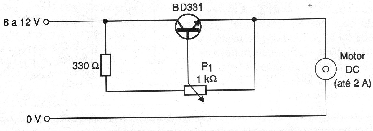 El simple control de velocidad para motores de corriente continua mostrado en la figura puede controlar cargas de hasta 3 ampères. El transistor debe montarse en un buen radiador de calor. El circuito funciona con motores de 6 a 12 volts. El resistor de 330 ohms eventualmente puede ser aumentado así como P1 para motores con corrientes menores a 500 mA para poder trabajar con menor corriente en el potenciómetro.