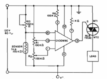 Este circuito se obtuvo de una documentación antigua de la RCA. El circuito integrado consiste en un comparador, cuyo punto de disparo se ajusta en los trimpots en función de la resistencia presentada por el sensor. El circuito se puede cambiar para utilizar componentes más modernos.