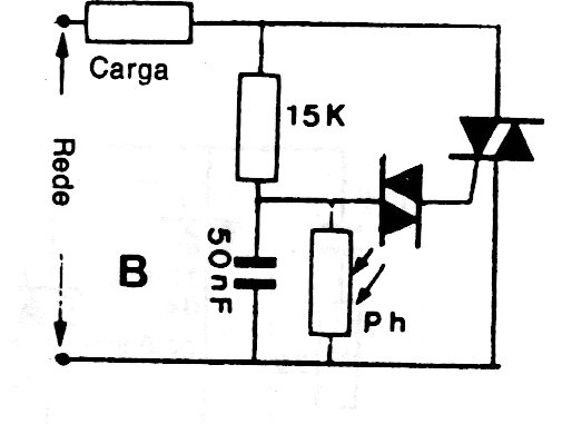 Este circuito dispara un triac cuando la luz que incide en el foto-resistor es cortada. Finalmente, el resistor de 15k debe ser cambiado para obtener el punto ideal de disparo. Este componente puede ser sustituido por un potenciómetro de 47k en serie con un resistor de 2k2.