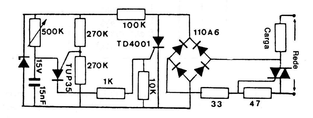 Este circuito se obtuvo en un esquemático de los años 90. El SCR depende de la carga controlada y PUTs equivalentes pueden ser empleados. El transistor programable unijunción debe estar dotado de disipador de calor, según la carga controlada.