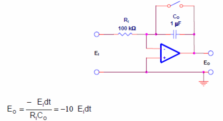 En la figura tenemos un integrador típico con amplificador operacional encontrado en una documentación de Texas Instruments de 2016. El circuito tiene su comportamiento dado por la fórmula junto al diagrama.