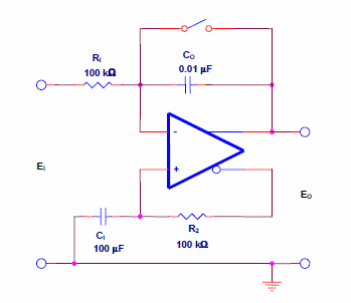 En la figura tenemos el circuito de un integrador para señales alternas. Las características obtenidas dependen del amplificador operacional utilizado. El circuito es de una documentación de Texas Instruments de 2016.