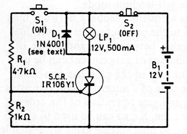 Este circuito muestra cómo disparar y apagar un SCR usando interruptores comunes de presión. El circuito fue encontrado en una documentación inglesa de los años 70, pero es actual, pues puede ser empleado con la mayoría de los SCR comunes, como los de la serie TIC.