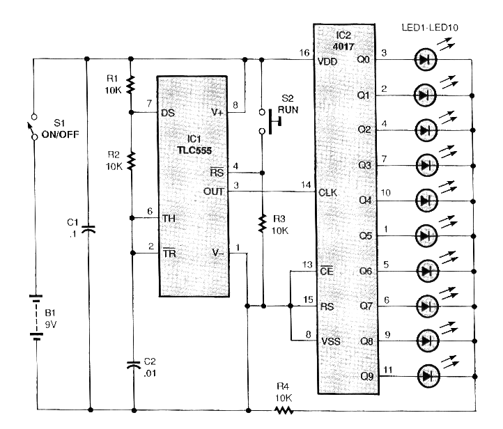 Este circuito salió en una Poptronics de 1996. La revista ya no existe, pero podemos encontrar muchos circuitos interesantes en las ediciones antiguas, los cuales estaremos comentando en nuestro sitio. Este sorteador utiliza los conocidos 555 y 4017. Cuando presionamos S2 los LEDs corren tan rápido que no podemos ver, pero al soltar sólo uno se enciende y es completamente impredecible cuál. El circuito puede ser alimentado por 9 V y la resistencia R4 nos parece muy alto para la aplicación, pues normalmente usamos resistores de 1k a 2k2 en esta función.