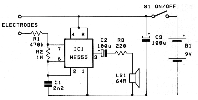 Encontramos este simple circuito de biofeedback en una revista inglesa en una edición de mayo de 1987. El circuito genera tonos en un altavoz cuya frecuencia depende de la resistencia entre los electrodos. Para generar pulsos, aumente C1 a 100 nF o más. Estos electrodos pueden ser chapas de metal para apoyar los dedos o los tubos de metal para sujetar. En el diseño original se utiliza un altavoz de 64 ohmios, pero se puede reducir R3 a 100 ohmios y utilizar un altavoz de 8 ohmios, o conectar directamente el pin 3 del 555 a una resistencia de 1k en la base de Un BD135 donde tenemos un altavoz como carga de colector. El circuito funciona con tensiones de 5 a 9 V.