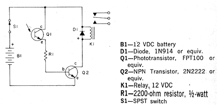 Este circuito fue sugerido por 101 Electronics Projects de 1979. Con él se puede accionar un relé a través del haz de luz una linterna común. El foto-transistor, en principio puede ser cualquiera, pero los tipos Darlington pueden resultar en mayor sensibilidad. Para mejorar la sensibilidad y la directividad, el foto-transistor debe montarse en un tubo opaco con una lente. La tensión de alimentación puede ser de 6, 9 o 12 V, según el relé utilizado.