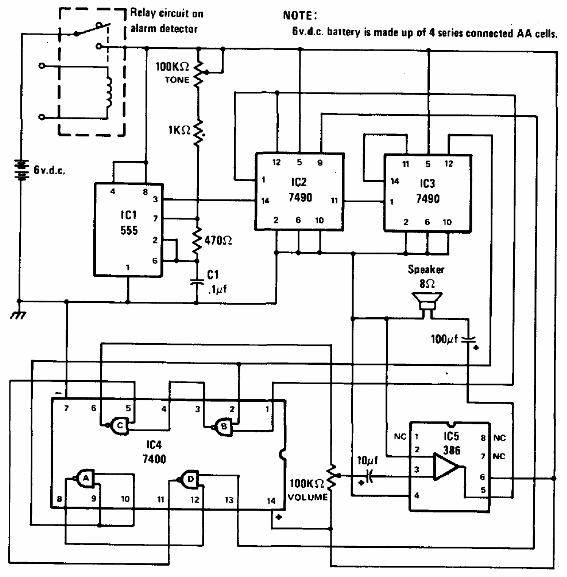Encontramos este circuito en una Modern Electronics de 1976. El circuito debe ser alimentado con 5 V. Con 6 V, es recomendable conectar en serie con la batería un diodo 1N4002. El sonido tiene las mismas características de la policía de algunos países de Europa.