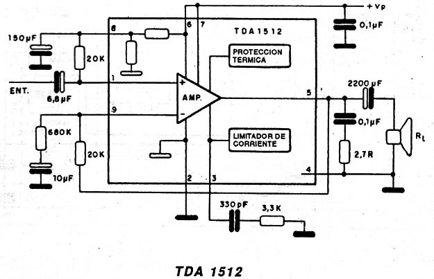 Este amplificador de audio con etapas de entrada diferenciales está proyectado para funcionar con fuentes asimétricas a partir de la red local (15 a 35V. El TDA1512 viene en cubierta SIL de 9 pinos pero también puede obtenérselo con los terminales doblados en forma DlL. Entre las ventajas indicadas por el fabricante tenemos:
