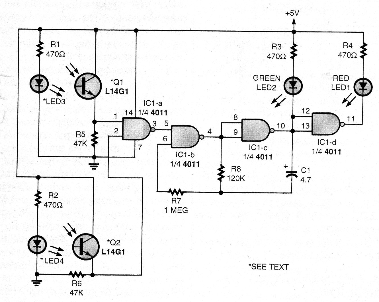 Este circuito utiliza dos sensores que se colocan en el cruce de un ferrocarril en miniatura, haciendo que dos LED parpadeen alternativamente en el paso de la composición. El circuito utiliza foto-transistores comunes como sensores. Encontramos esta configuración en una publicación americana de 1998.