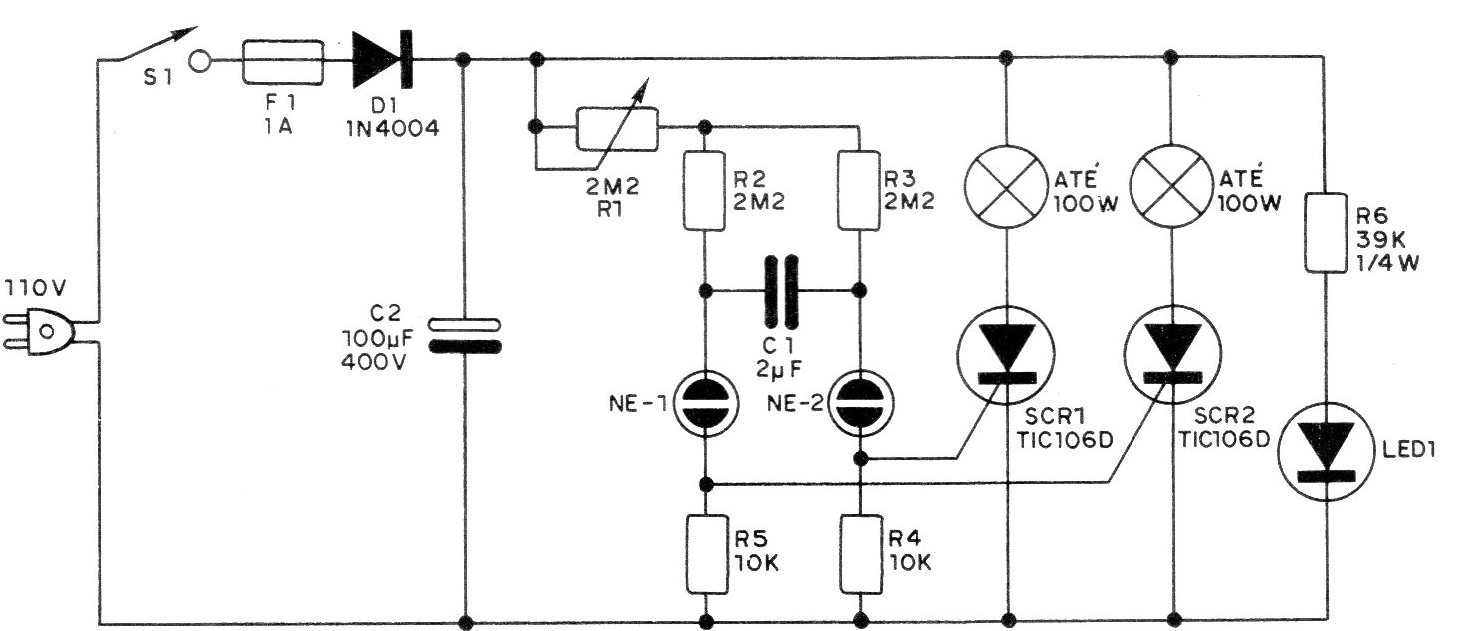 El parpadeante que presentamos fue encontrado en una publicación de 1982, siendo mostrado en la figura. Lo que tenemos es un multivibrador que utiliza dos lámparas neón como elementos básicos, las cuales accionan dos SCRs del tipo TIC106D. La frecuencia de los intermitentes está determinada por el valor del capacitor C1, que puede tener capacidades entre 22 nF y 2 uF. Este capacitor es de tipo despolarizado, de poliéster, con una tensión de trabajo de al menos 400 V. Cada SCR puede alimentar 100 W de lámparas, en cuyo caso deben montarse en disipadores de calor. Si las bombillas de menos de 40 W, en total, en cada SCR, se alimentan, los SCR no necesitará un disipador de calor. El autor informa que, con una capacitancia de 2 uF a C1, el período de los intermitentes es del orden de 20 segundos. El potenciómetro P1 permite ajustar sensiblemente el intervalo de los intermitentes. Observamos que, por el uso de SCRs y de un diodo rectificador en la entrada, las lámparas se alimentan en apenas media onda. Su brillo en estas condiciones no es el máximo. Las lámparas de neón pueden ser del tipo NE-2H, y el LED sirve para indicar el funcionamiento del aparato.