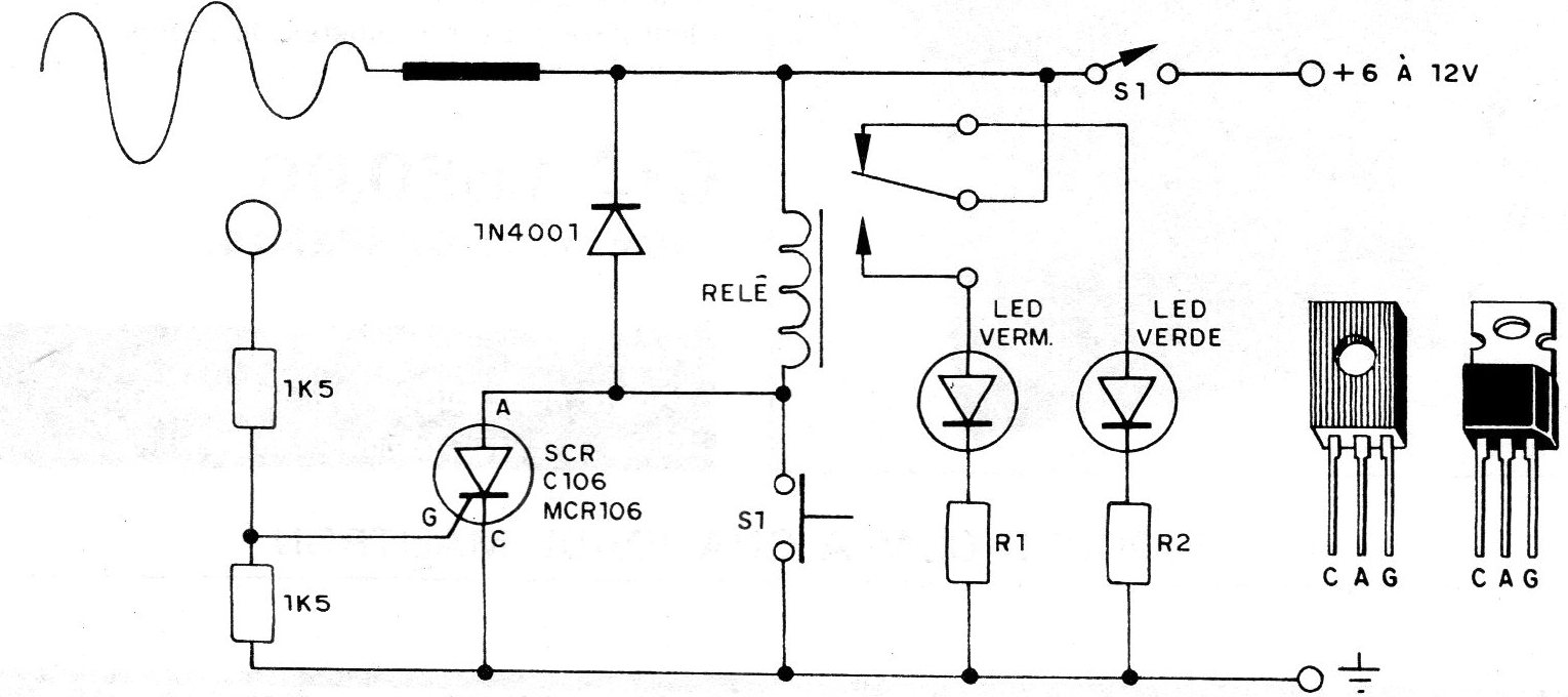 Este circuito fue encontrado en una publicación de 1981 y consiste en un interesante juego de habilidad manual. El circuito completo del juego se muestra en la figura y funciona de la siguiente manera: el jugador debe buscar pasar la argola por el alambre tortuoso sin dejar que un respaldo en el otro. Si esto ocurre, el circuito dispara cerrando el contacto del relé que entonces cambia la indicación visual de verde a rojo. Si esto ocurre un punto negativo debe ser contado para el jugador o entonces el mismo debe ser descalificado para dar oportunidad a otro. El rearme del circuito en cada disparo se realiza presionando el interruptor S1 en paralelo con el SCR. La alimentación del circuito se realiza con una tensión de 6 o 12 V y el relé debe elegirse para cerrar con este valor. Debemos observar que debe ser considerada en la sensibilidad del relé la pequeña caída de tensión del orden de 2 V que ocurre en el SCR en conducción. Los resistores R1 y R2 conectados en serie con los LED tienen sus valores elegidos según la tensión de alimentación. Para una tensión de 6 V las resistencias pueden ser de 27º R x 1/8 W y para 12 V de 470 R x 1/8 W.