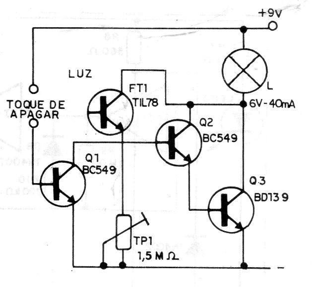 Ver magia o lámpara mágica, como también aparece en diversos artículos de este sitio, es un circuito que permite encender una lámpara con un fósforo y borrar con toque. El circuito puede utilizar LED en lugar de las lámparas, con resistencias apropiadas en serie. El sensor de tacto está formado por dos planchas que se deben tocar simultáneamente.