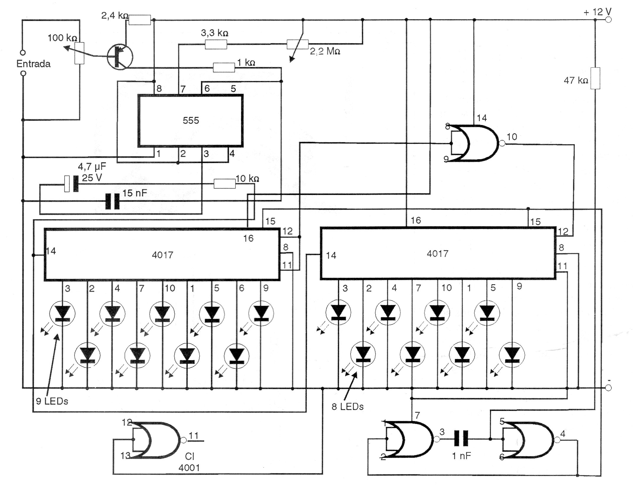 Este circuito de VU tiene un efecto diferente dado por el uso de dos 4017. El circuito es de una documentación de 1997 siendo conectado en la salida de cualquier amplificador. En el proyecto original no se previó una protección de entrada que sería recomendable. Se puede utilizar una resistencia de 1k en serie con la base del transistor o la entrada. El circuito original está diseñado para ser utilizado en el coche pero debe funcionar con tensiones de 5 a 12 V.