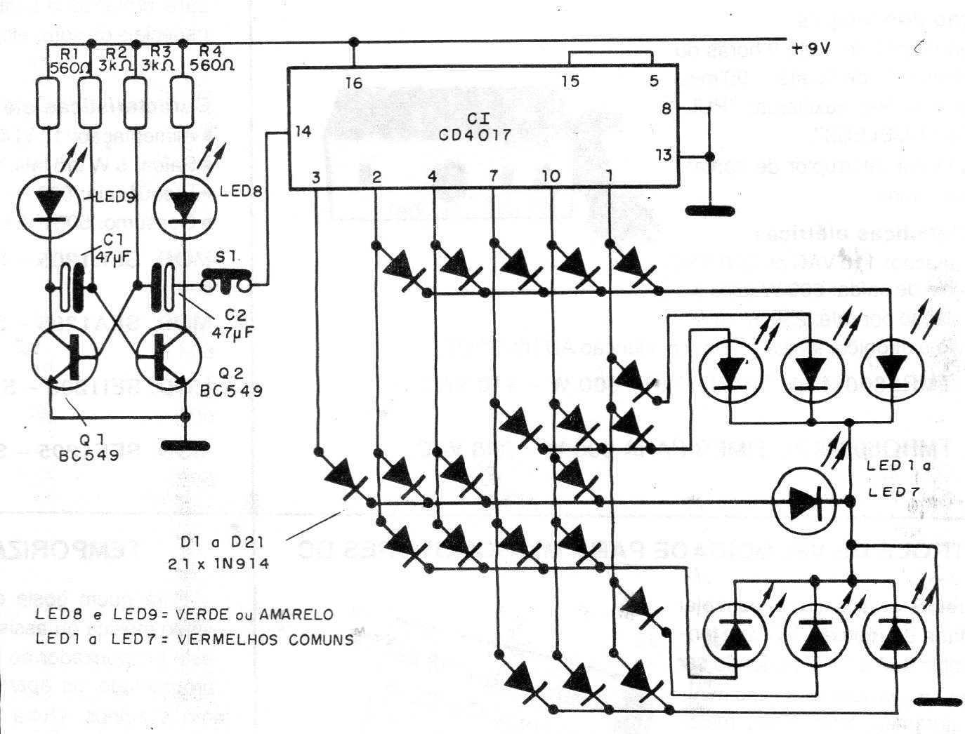 Encontramos este circuito en una documentación de 1992. Todavía puede montarse con facilidad en nuestros días, ya que los componentes usados son comunes. En él tenemos una configuración de LEDs que imita las caras de un dado, lo que le confiere mayor realismo la alimentación es hecha por batería de 9 V o fuente.