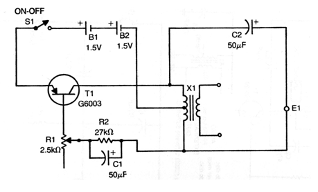 El circuito mostrado es de una publicación americana de 1970. Él produce un tono que atrae peces si se produce en un transductor sumergido. El circuito puede utilizar un BC558 y el transformador se ha obtenido de una radio transistorizada fuera de uso. El auricular puede ser una cápsula piezoeléctrica, en cuyo caso C2 puede ser eliminado del circuito. El ajuste se realiza en R1 que puede ser un potenciómetro más grande para mayor rango de ajuste, por ejemplo, 47k.