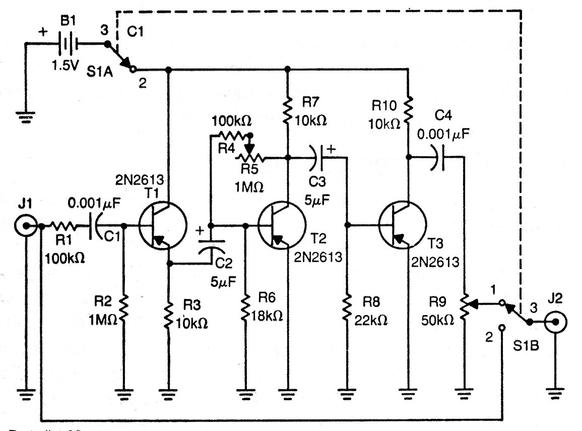 Este circuito de distorsión fue encontrado en una publicación americana de 1970. Puede ser montado con transistores más modernos como los BC558. Su alimentación es hecha por una sola pila. Los cables de entrada y de salida de señal deben ser blindados. Los ajustes se hacen en los dos potenciómetros. El de salida puede ser de 47k en lugar de 50k ya que este valor no es común actualmente.