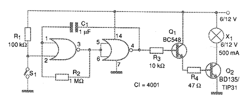 En la figura mostramos otra aplicación interesante para el circuito integrado 4001. Este circuito hace que una lámpara parpadee produciendo flashes en la frecuencia de 1 Hz, determinados por el capacitor C1. Las lámparas de hasta 500 mA pueden controlarse con el transistor BD135 y con el uso del TIP31 lámparas de potencias mayores se pueden utilizar. El transistor de potencia debe montarse en un radiador de calor y la alimentación puede realizarse con tensiones de 6 a 12 V según la lámpara. Una aplicación interesante para este circuito es en señalización automotriz. Observe que el circuito posee una llave de accionamiento de bajo consumo que se utiliza para controlarlo sin la necesidad de actuar directamente sobre la alimentación. Esto significa que en lugar de esta llave podemos utilizar sensores de bajo consumo como reed-switches en sistemas de alarmas. En este caso, basta con sustituir la lámpara por un buen oscilador de audio, un timbre o un relé que acciona un sistema potente.